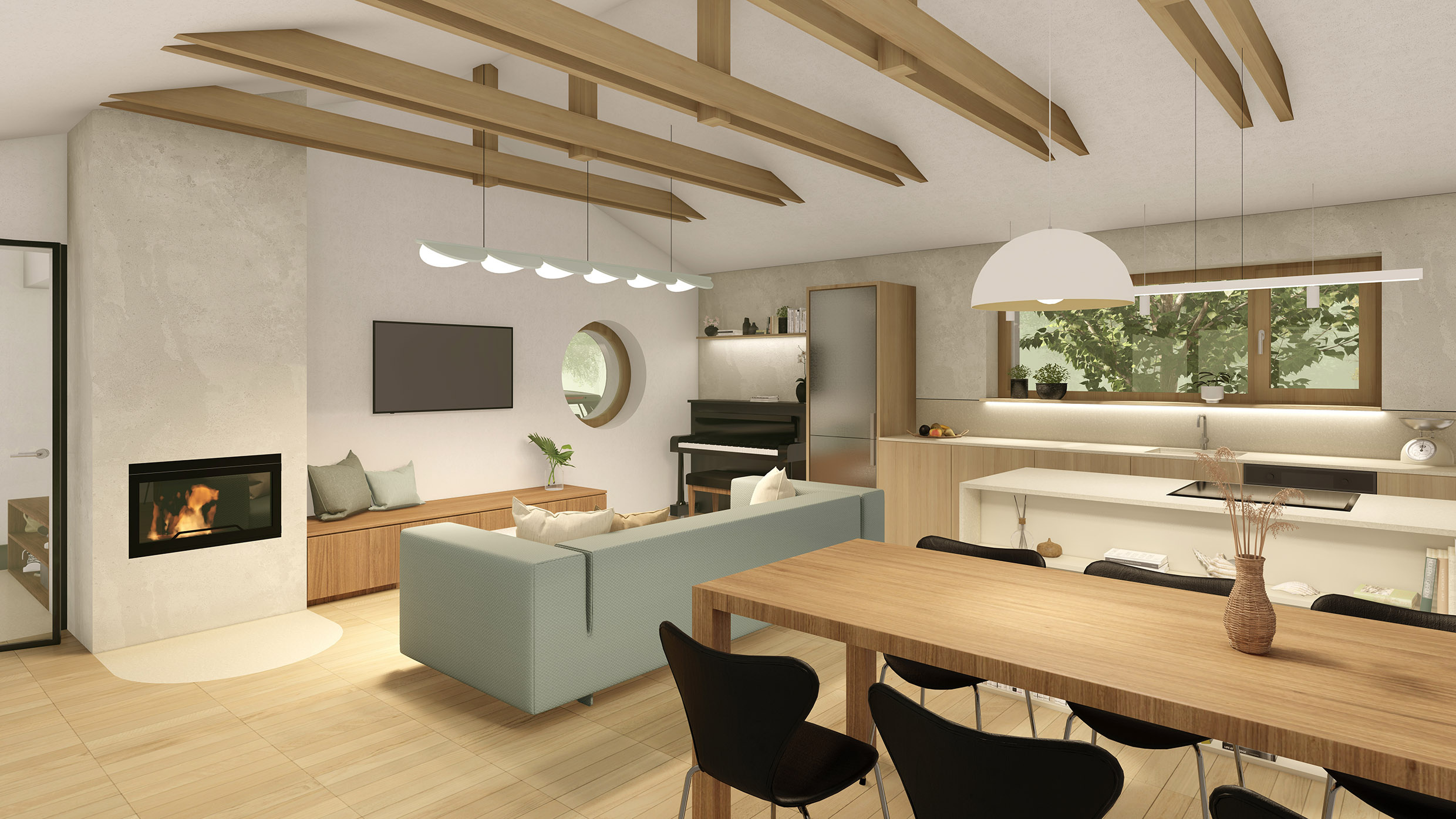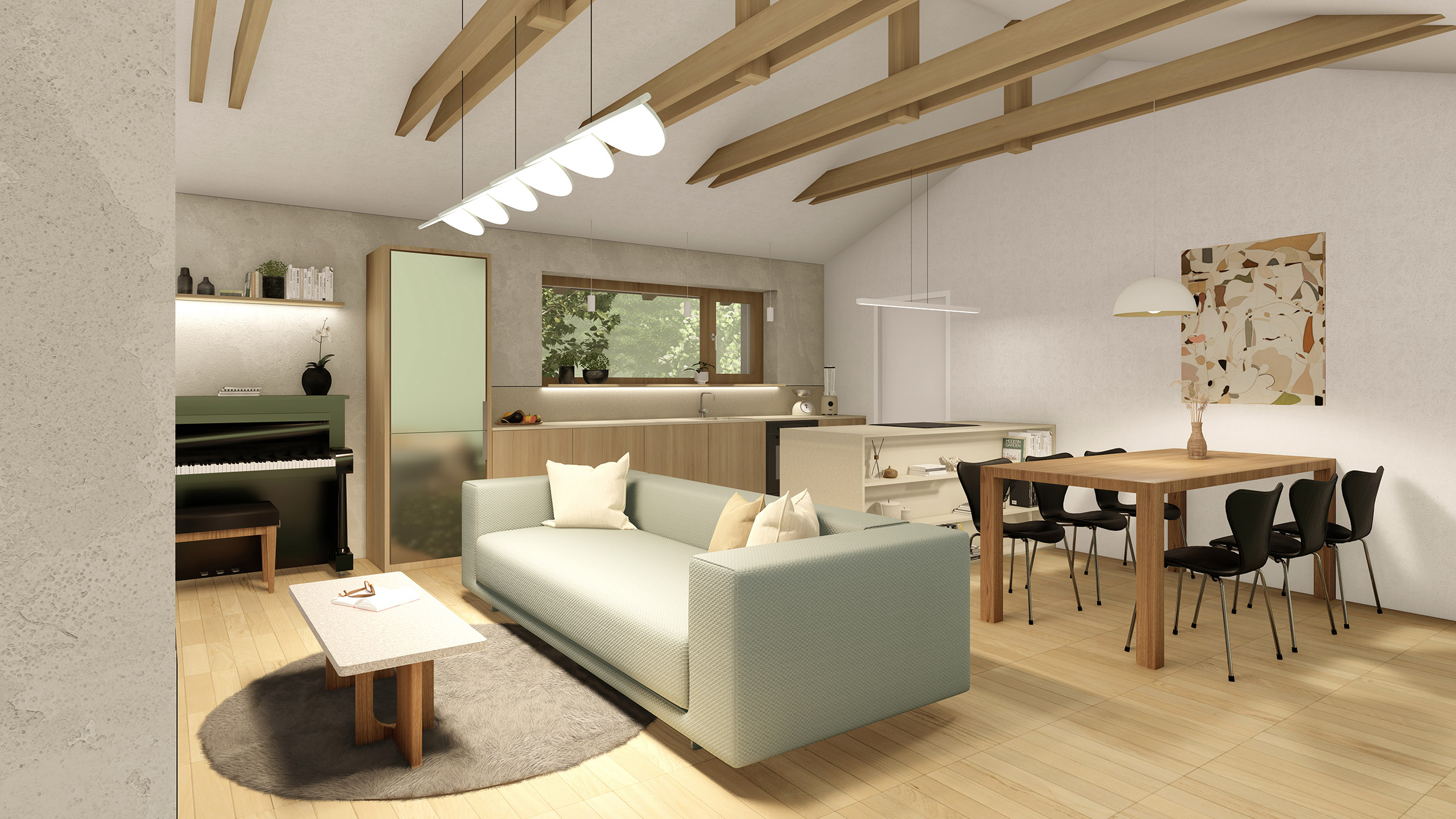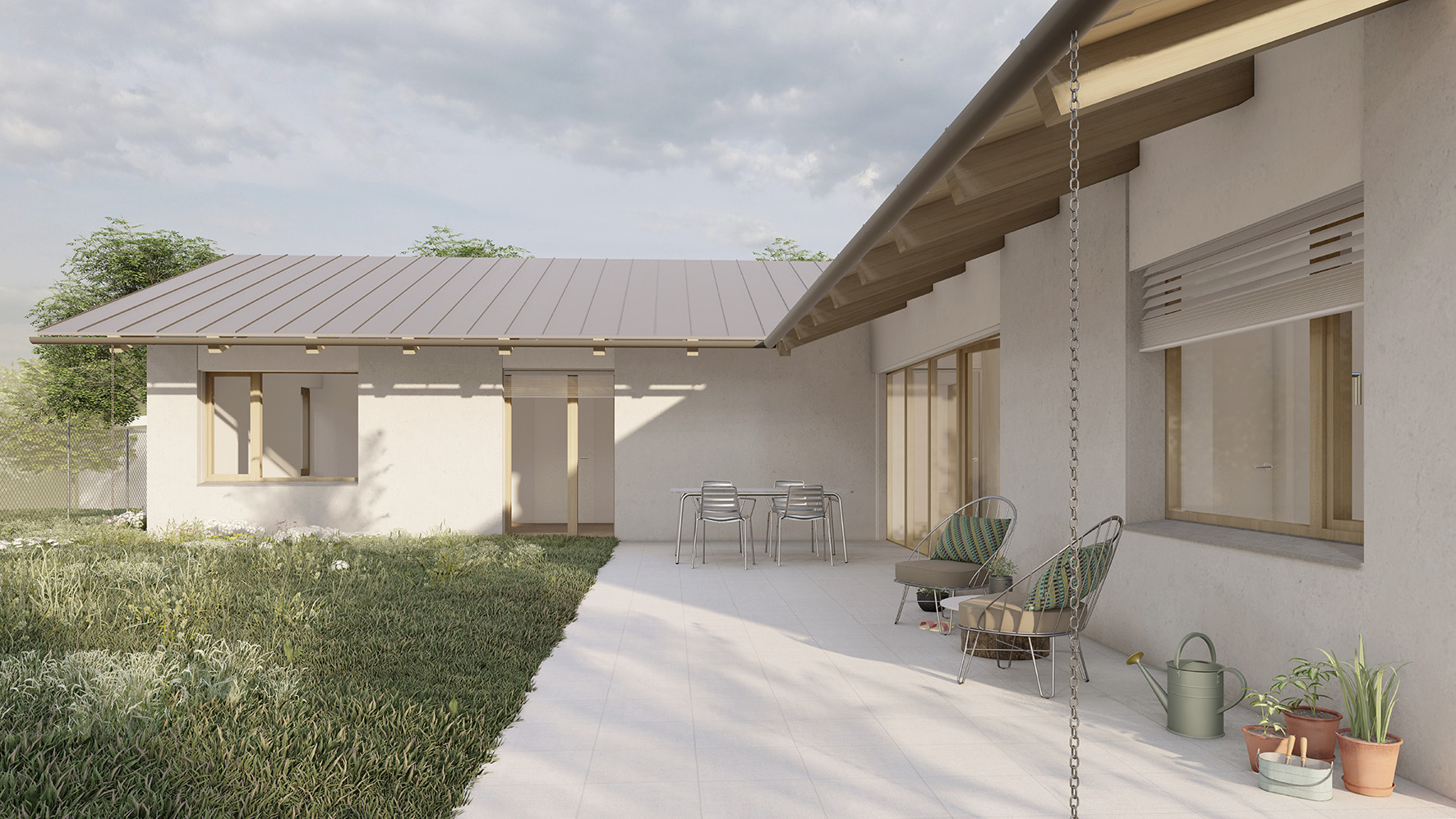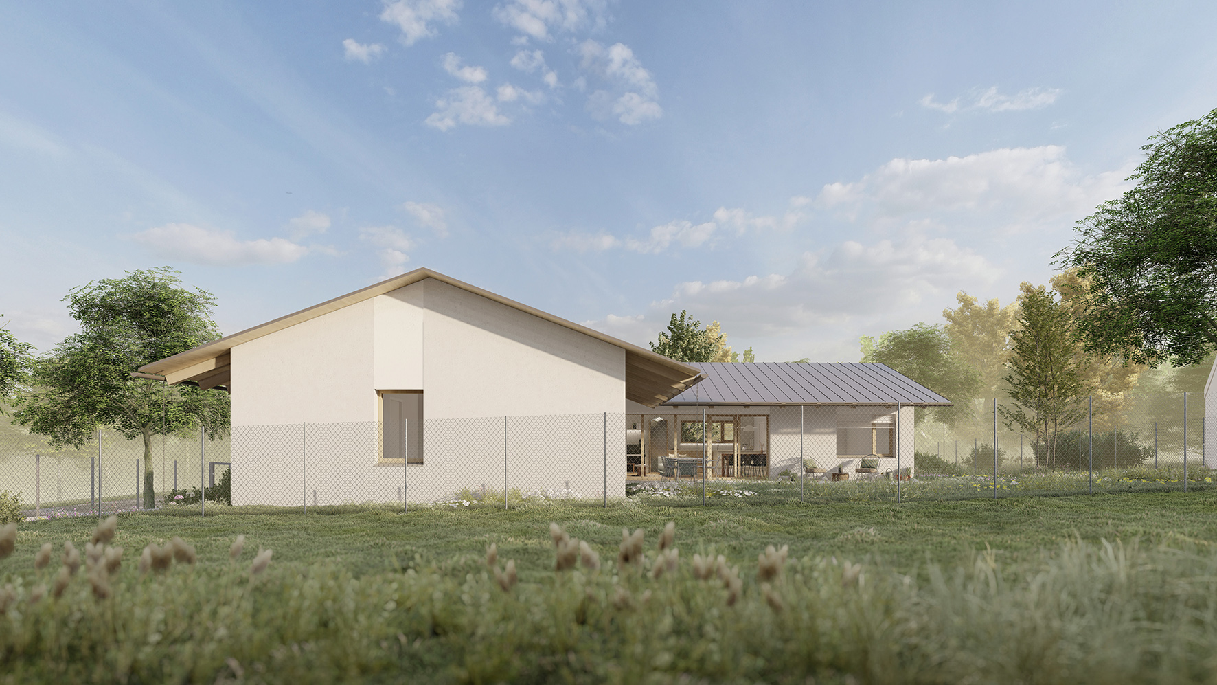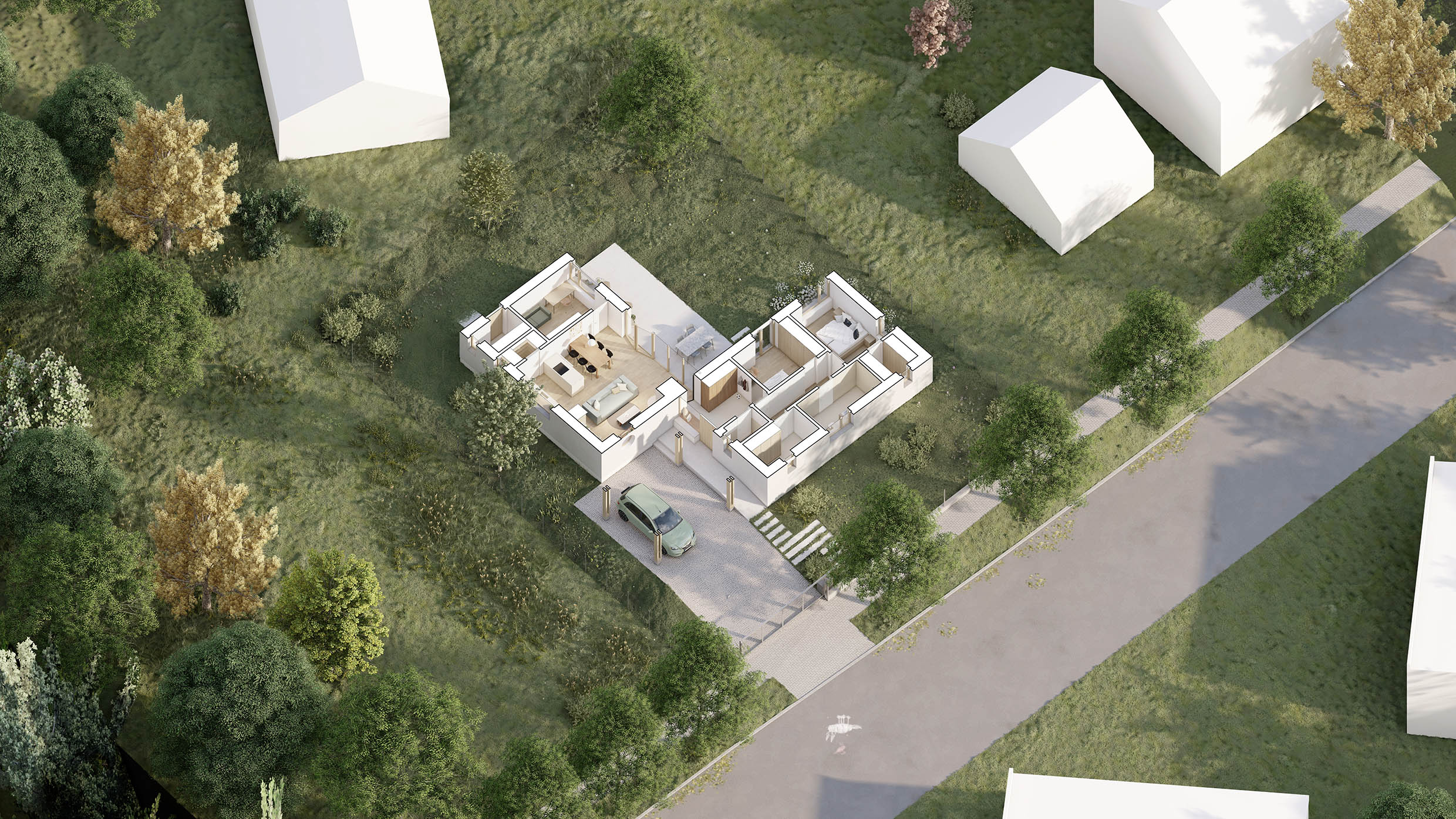 Dispozice domu navazuje na koncept dvou hmot do tvaru L. Levý objekt tvoří noční, soukromější část a pravý objekt část společenskou. Společenská část je podpořena vertikálou – otevřením do krovu a přiznaným krovem, čímž dochází k velkorysejšímu pojetí prostoru.