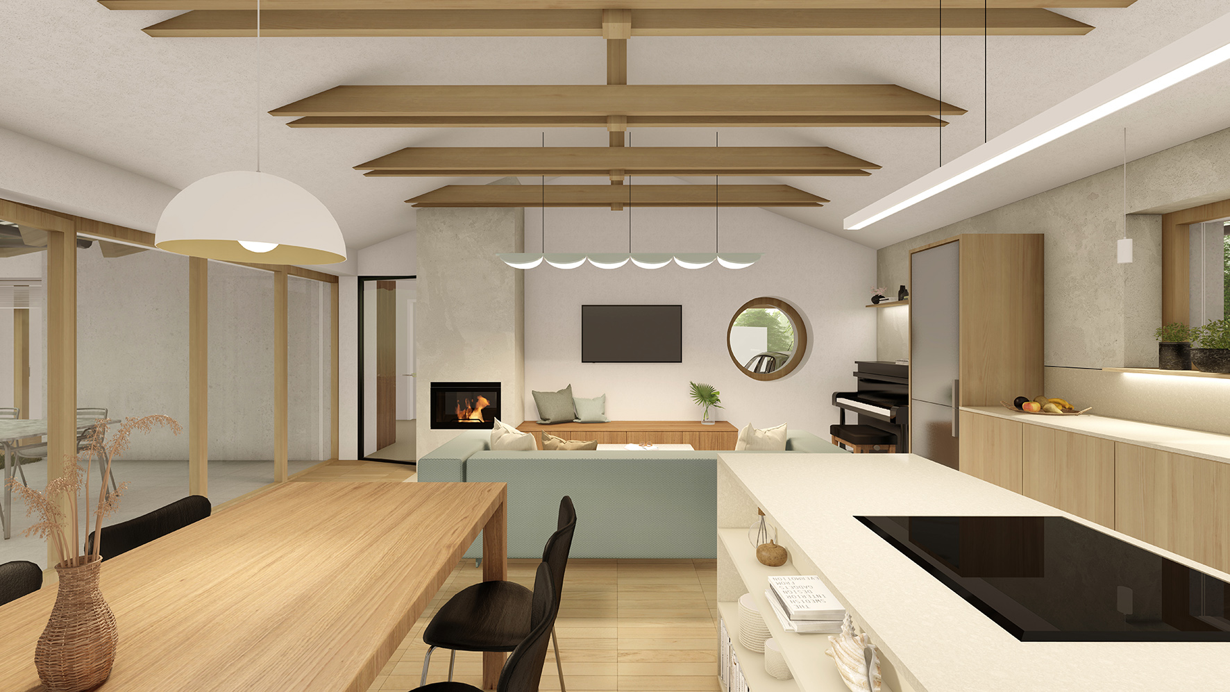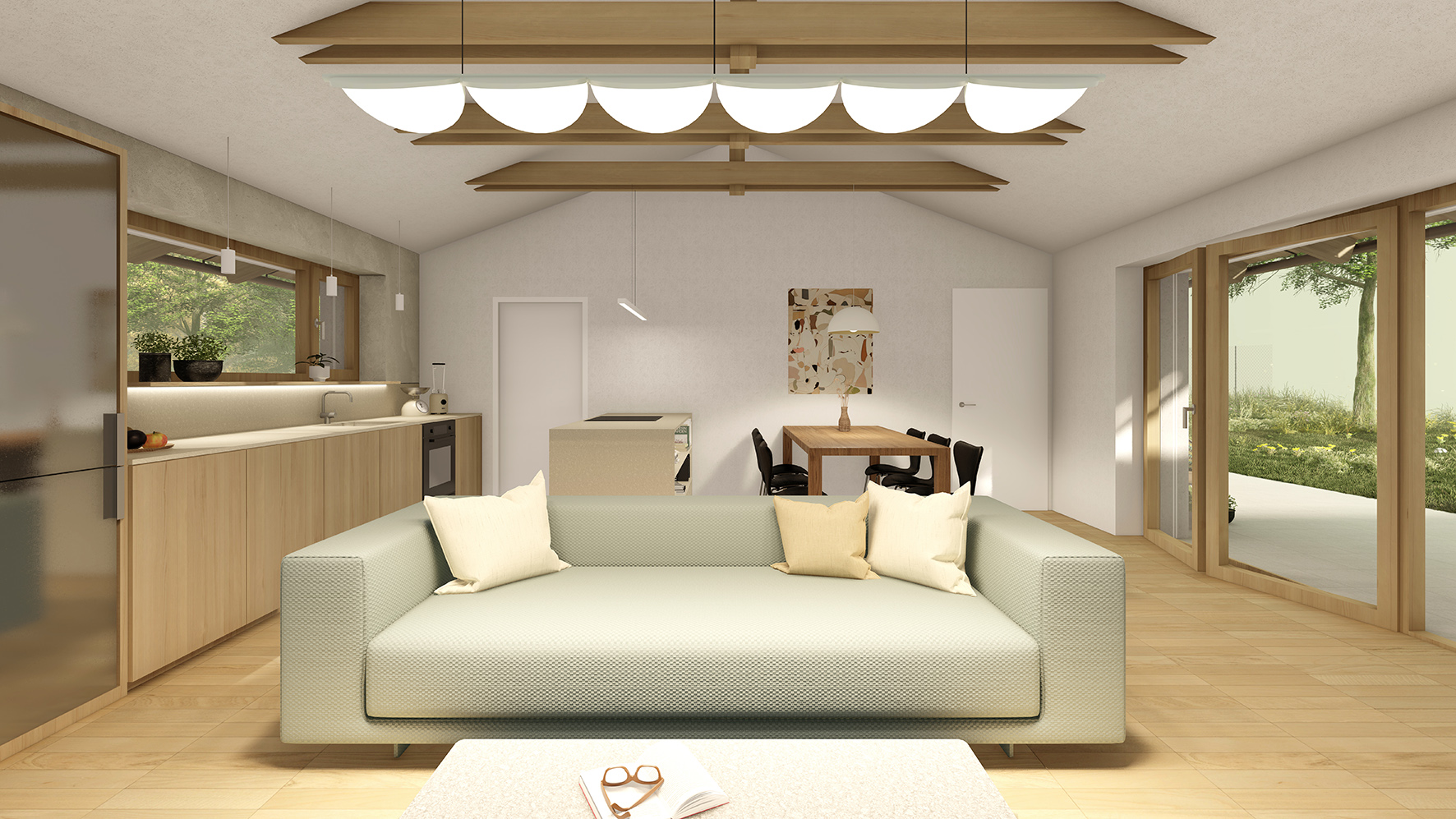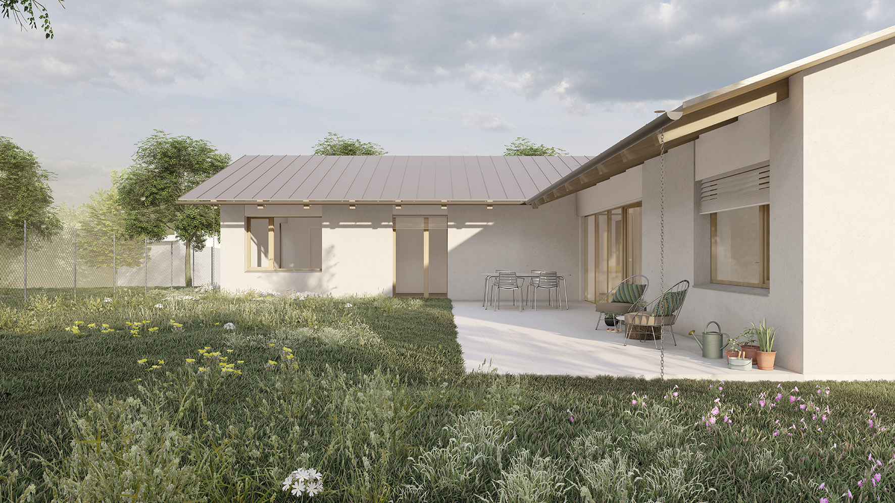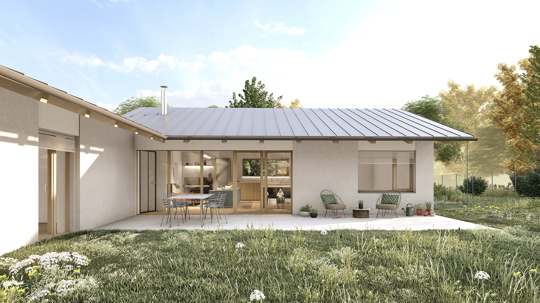 Dispozice domu navazuje na koncept dvou hmot do tvaru L. Levý objekt tvoří noční, soukromější část a pravý objekt část společenskou. Společenská část je podpořena vertikálou – otevřením do krovu a přiznaným krovem, čímž dochází k velkorysejšímu pojetí prostoru.