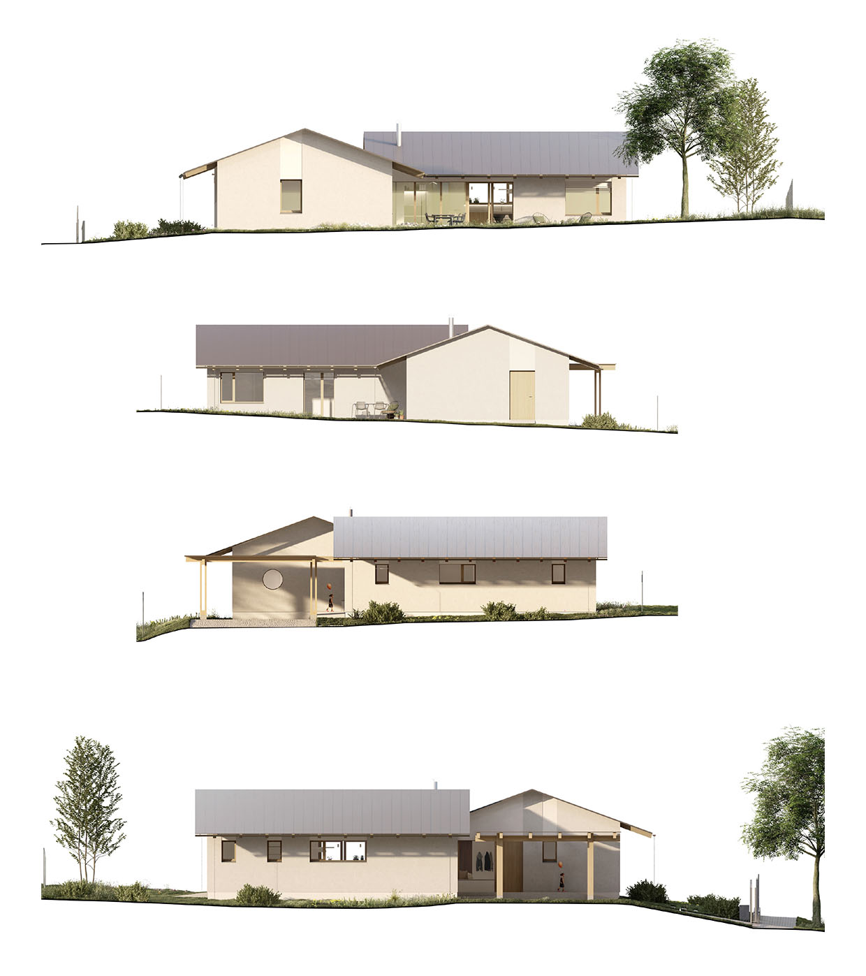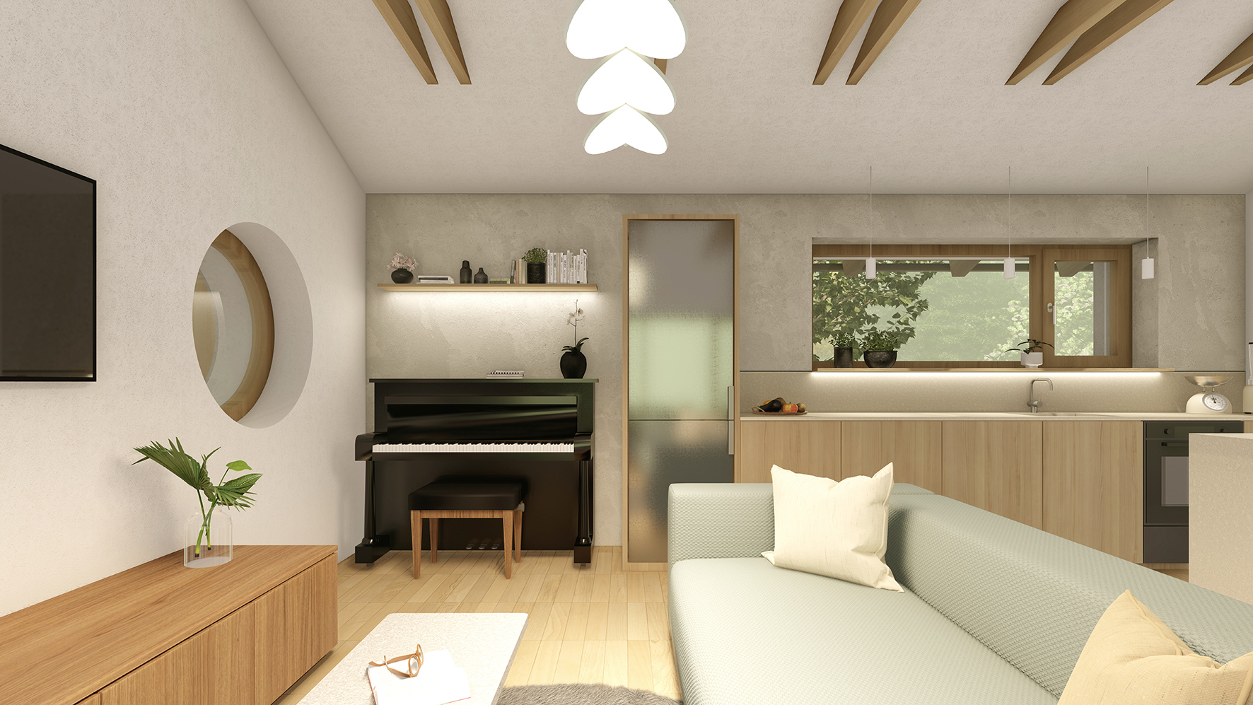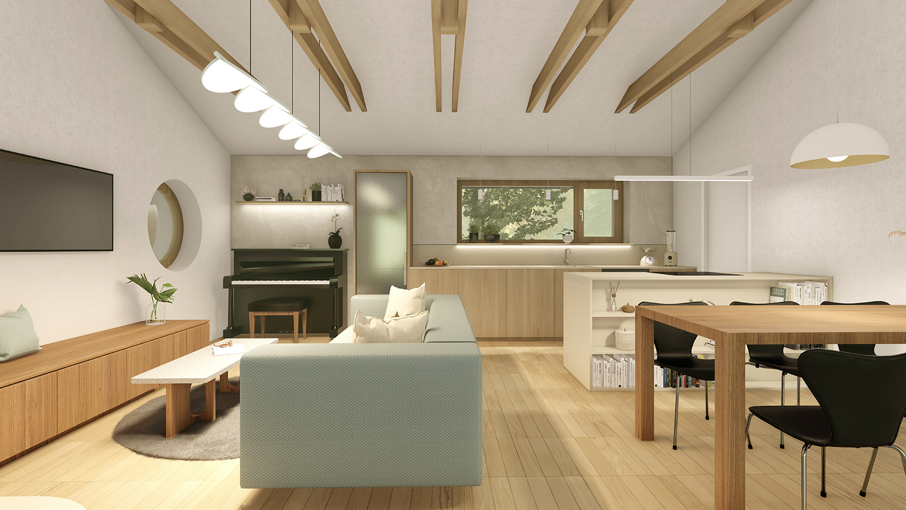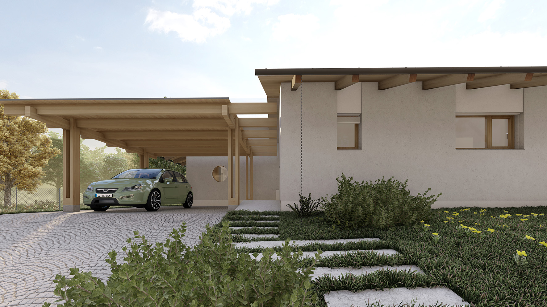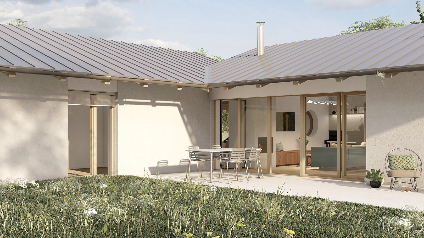 Dispozice domu navazuje na koncept dvou hmot do tvaru L. Levý objekt tvoří noční, soukromější část a pravý objekt část společenskou. Společenská část je podpořena vertikálou – otevřením do krovu a přiznaným krovem, čímž dochází k velkorysejšímu pojetí prostoru.