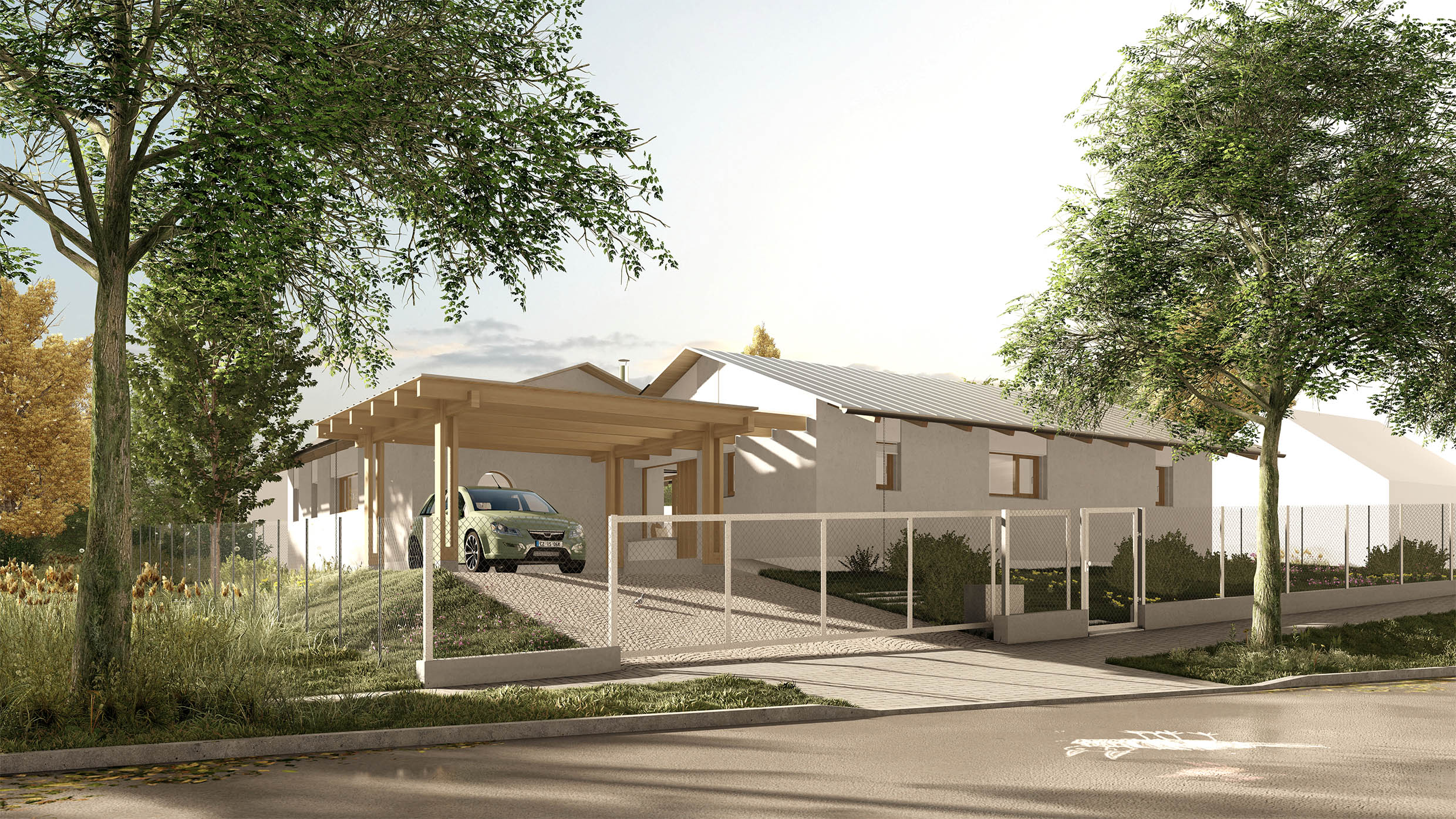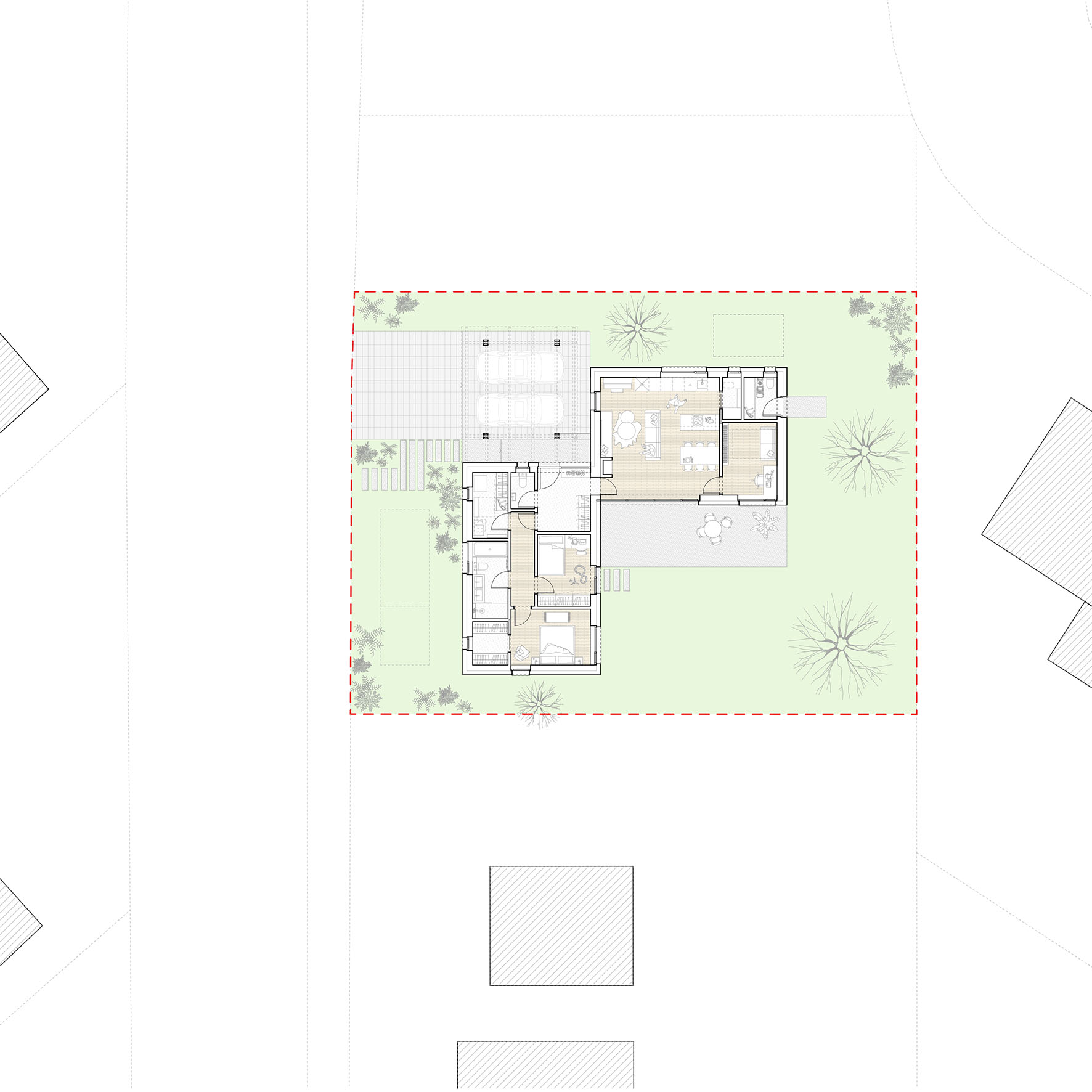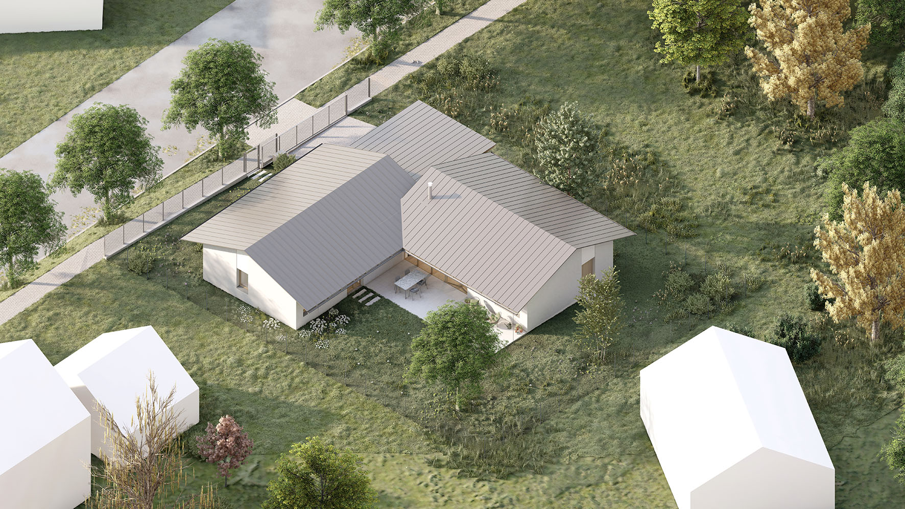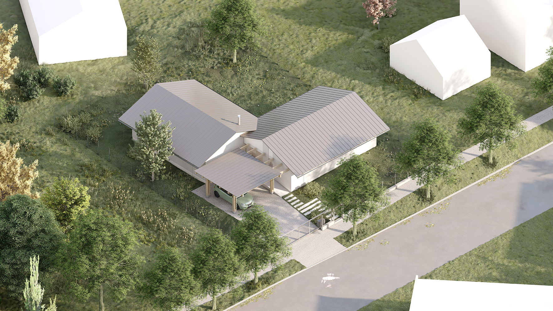 Urbanistické řešení a samotný tvar domu je dán více faktory. Parcela se nachází v zastavěném území v jejímž bezprostředním okolí se nachází zástavba rodinných domů. Aby došlo k maximálnímu využití potenciálu parcely a zároveň dle přání budoucích majitelů, došlo k rozbití klasické ucelené hmoty a vznikly dva objekty napojené na sebe do tvaru písmene “L” . Díky tomu dochází k odclonění komunikace na západní straně parcely a častečně i okolní zástavby. Vzniká tak soukromější část s venkovní terasou a posezením orientovanými na jiho-západ.