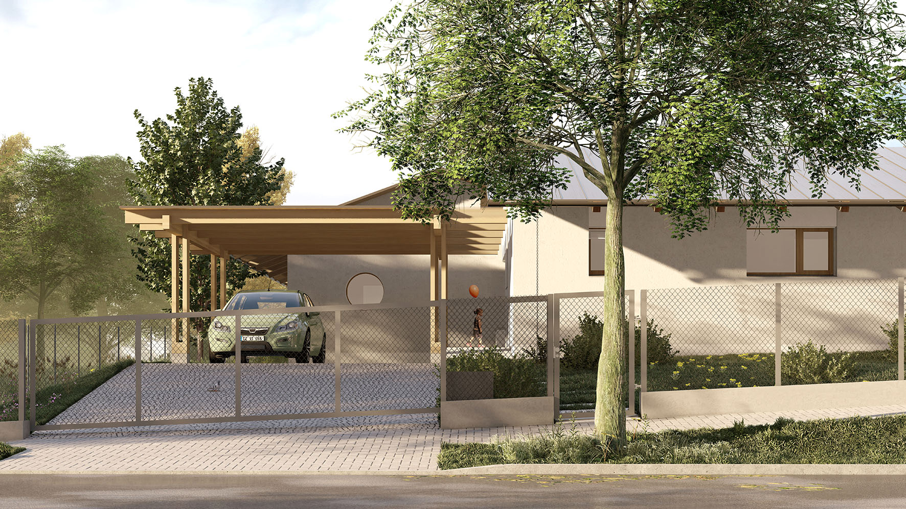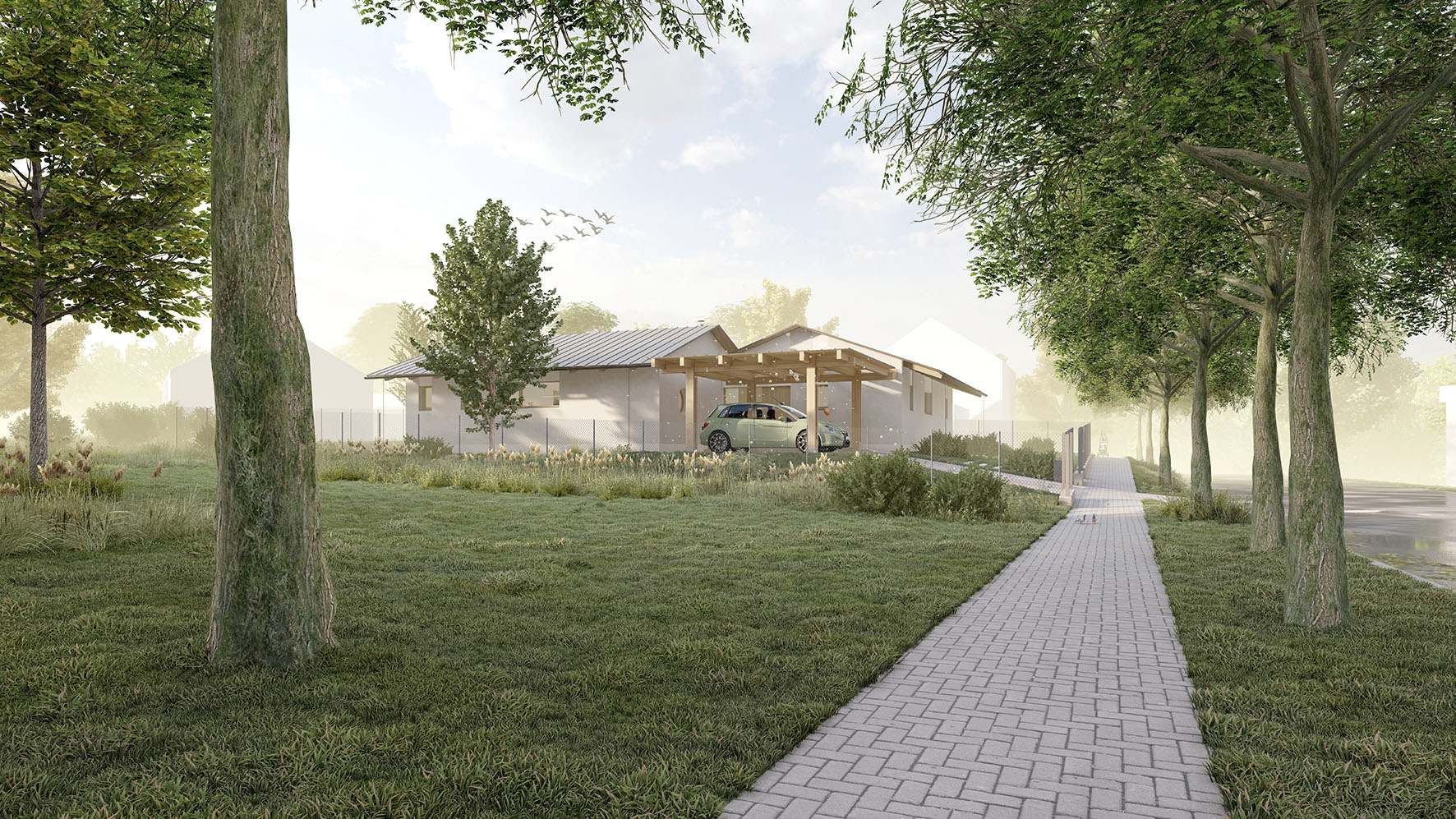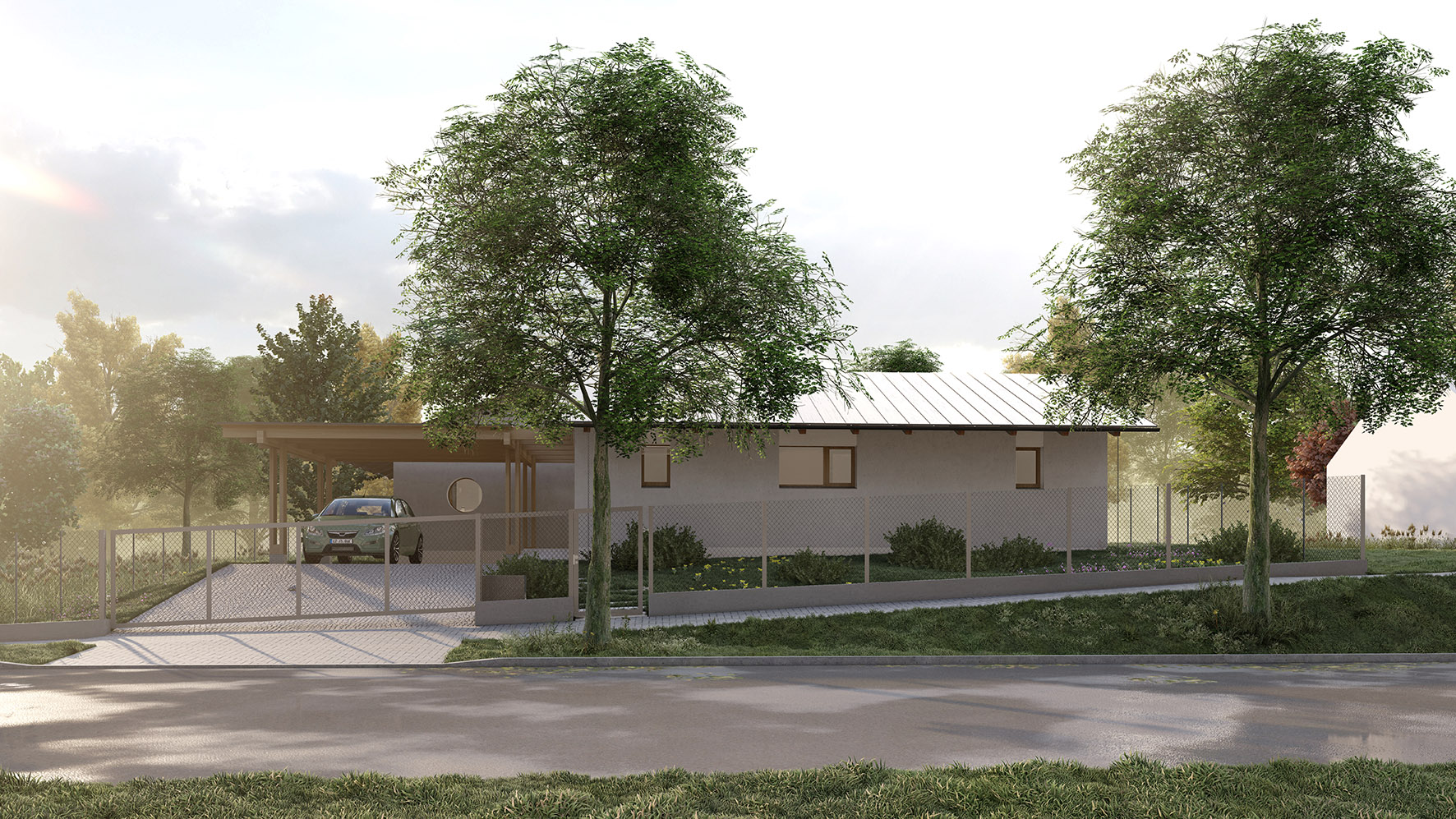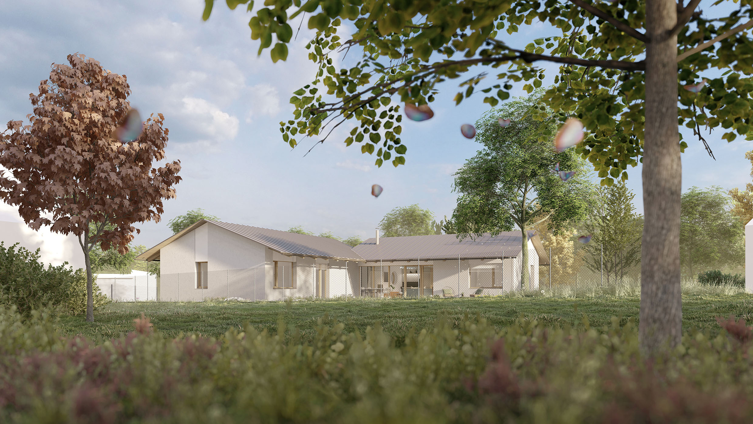 Urbanistické řešení a samotný tvar domu je dán více faktory. Parcela se nachází v zastavěném území v jejímž bezprostředním okolí se nachází zástavba rodinných domů. Aby došlo k maximálnímu využití potenciálu parcely a zároveň dle přání budoucích majitelů, došlo k rozbití klasické ucelené hmoty a vznikly dva objekty napojené na sebe do tvaru písmene “L” . Díky tomu dochází k odclonění komunikace na západní straně parcely a častečně i okolní zástavby. Vzniká tak soukromější část s venkovní terasou a posezením orientovanými na jiho-západ.