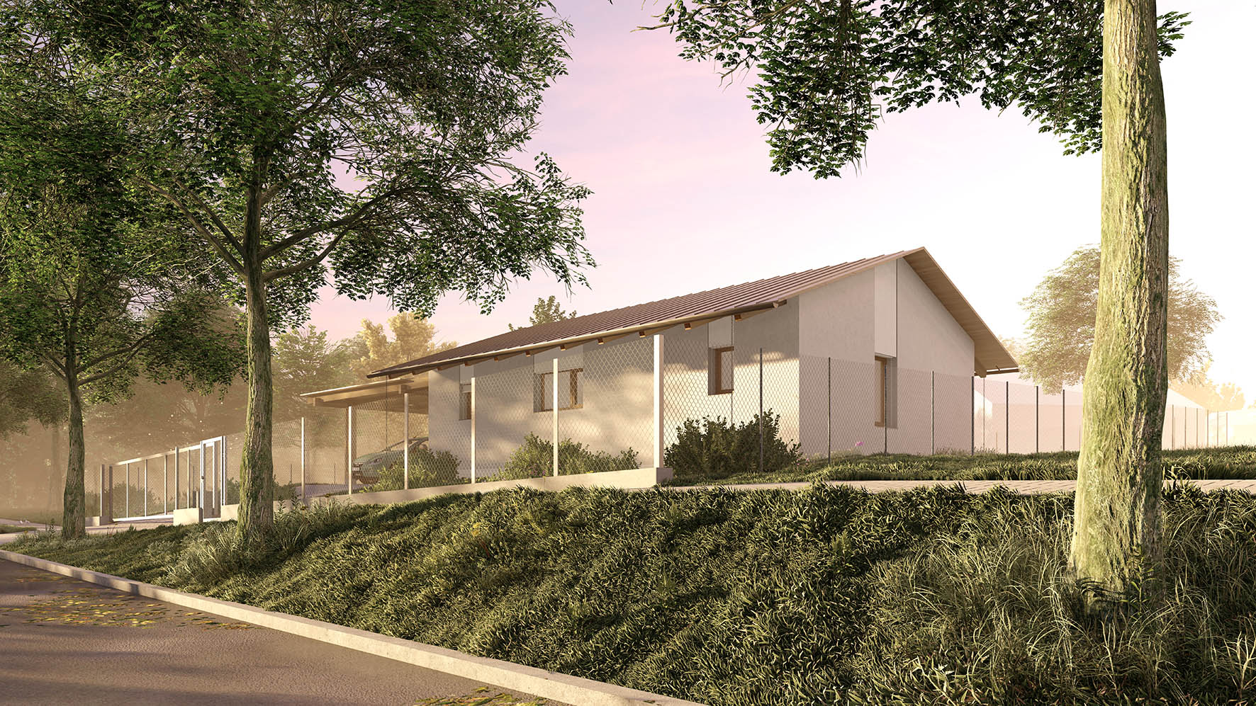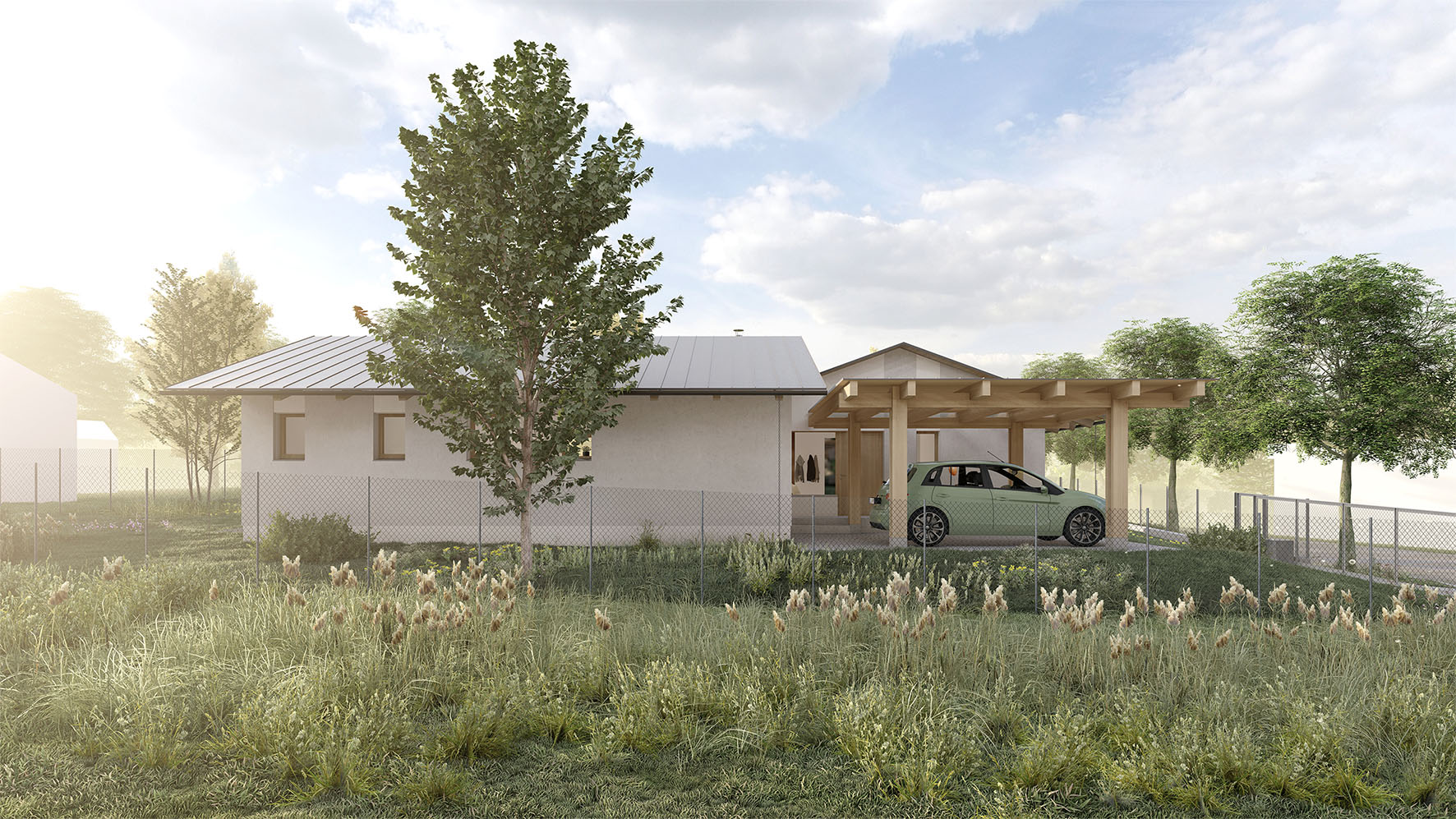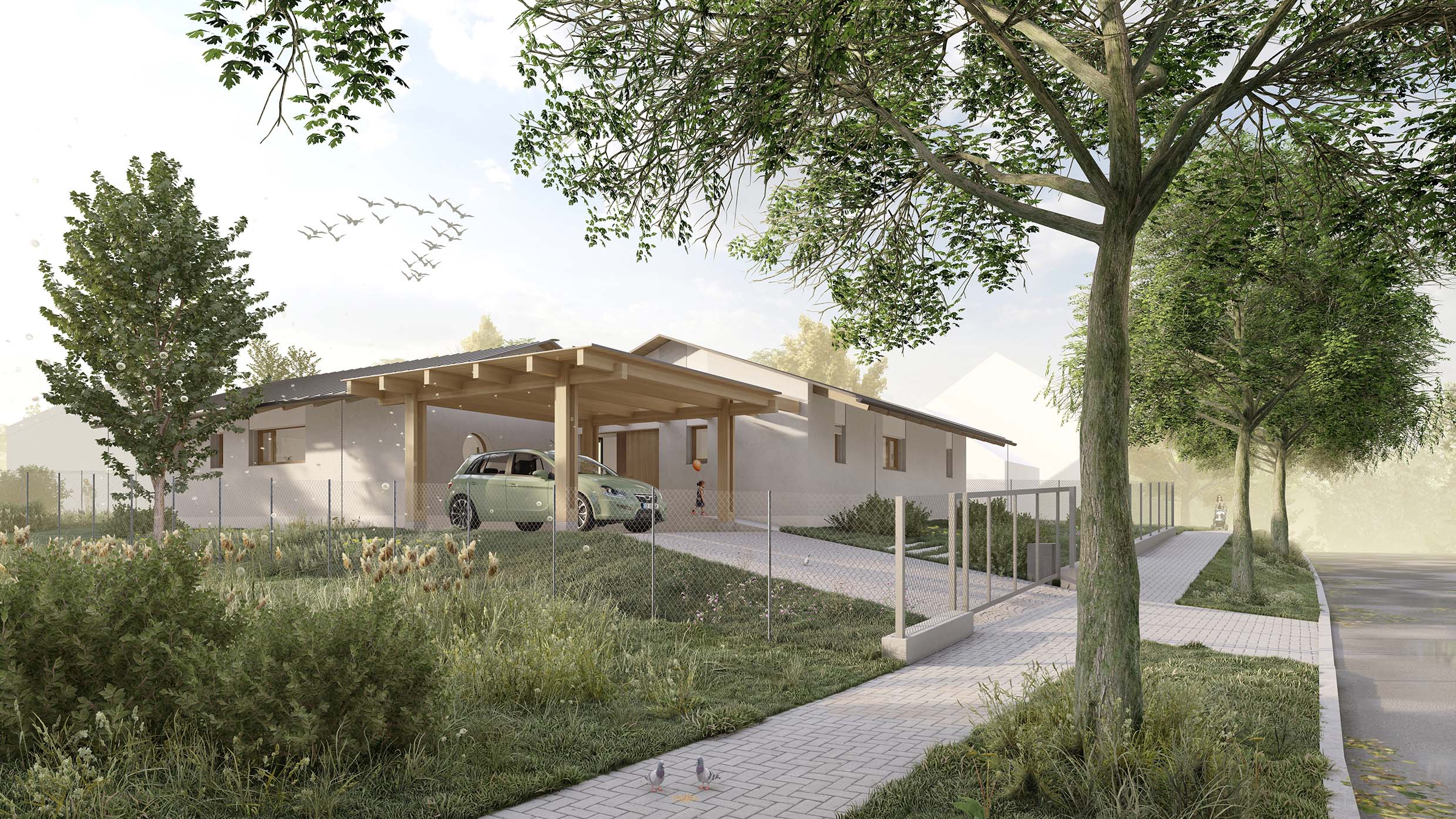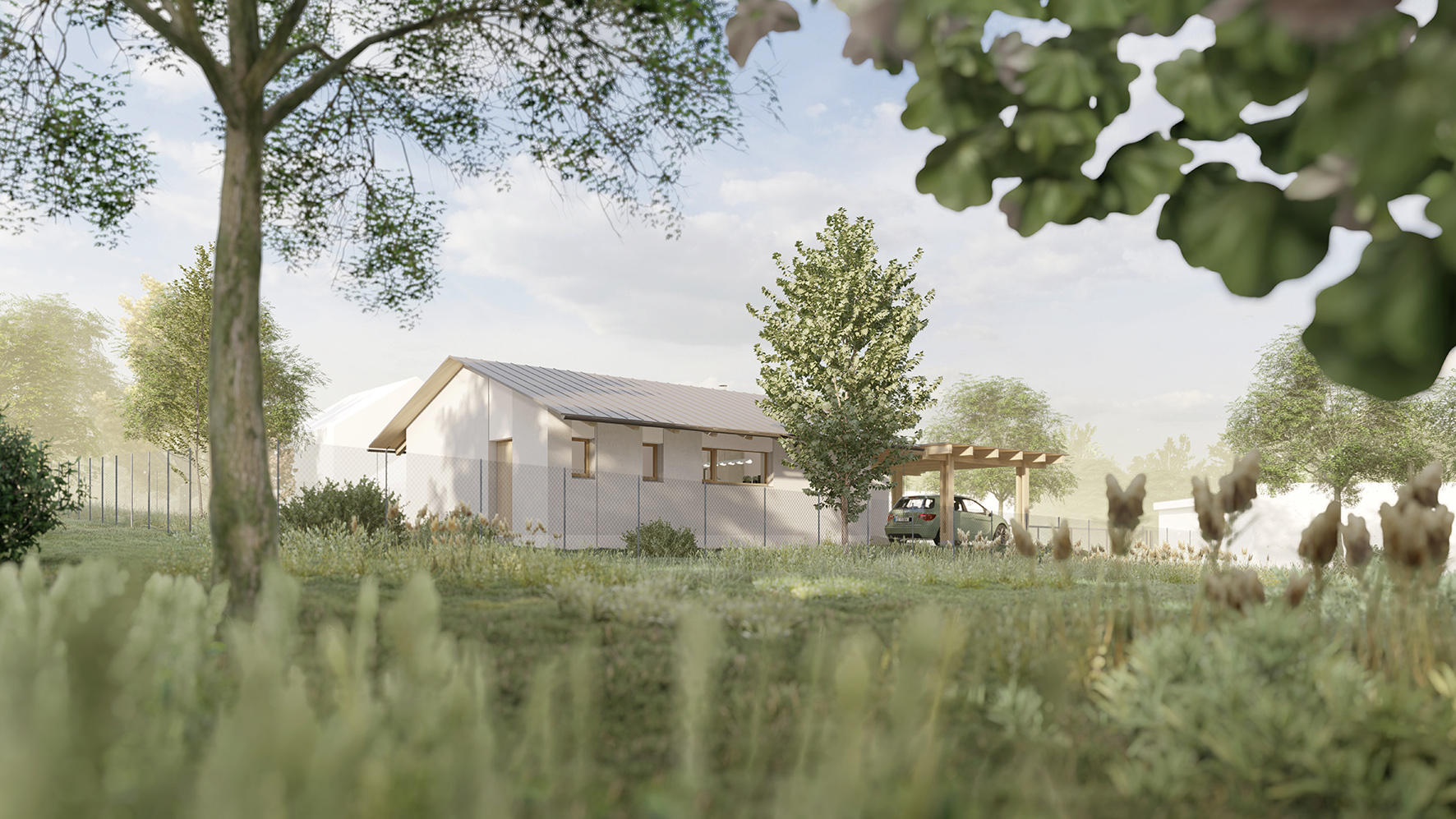 Urbanistické řešení a samotný tvar domu je dán více faktory. Parcela se nachází v zastavěném území v jejímž bezprostředním okolí se nachází zástavba rodinných domů. Aby došlo k maximálnímu využití potenciálu parcely a zároveň dle přání budoucích majitelů, došlo k rozbití klasické ucelené hmoty a vznikly dva objekty napojené na sebe do tvaru písmene “L” . Díky tomu dochází k odclonění komunikace na západní straně parcely a častečně i okolní zástavby. Vzniká tak soukromější část s venkovní terasou a posezením orientovanými na jiho-západ.